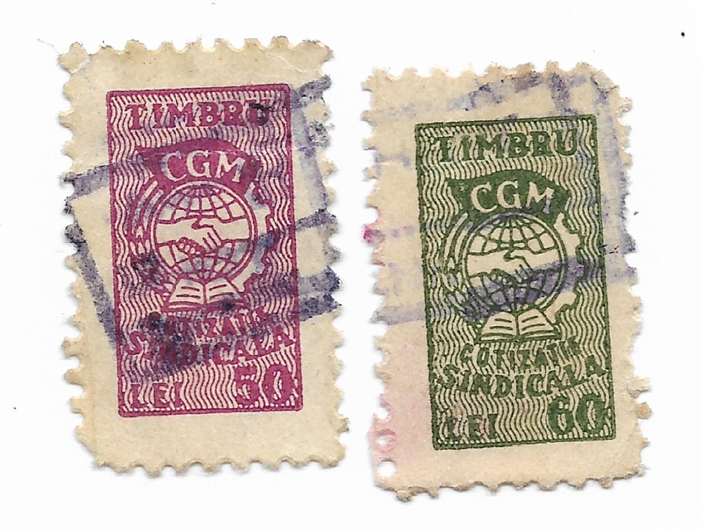 Timbre cotizatie C.G.M. (Confederatia Generala a Muncii), 1952, valorile de 50 L, 60 L, obliterate. Stare foarte buna.