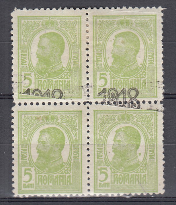 ROMANIA 1918 REGELE CAROL I ”TIPOGRAFIATE” SUPRATIPAR 1918 SUPRATIPAR DIAGONAL INCOMPLET BLOC DE 4 TIMBRE 3 CU SUPRATIPAR UN TIMBRU FARA SUPRATIPAR STARE MNH/SARNIERA