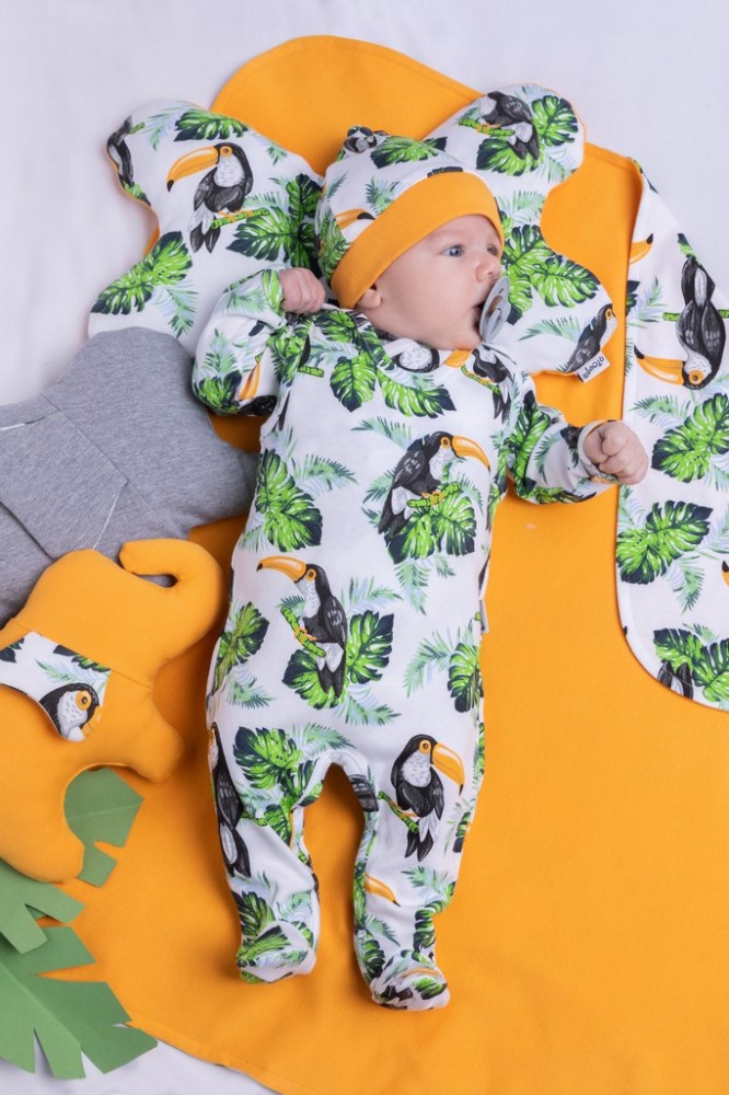 Romper confortabil de bumbac imprimat cu motiv Tucan. Bretelele se fixeaza cu capse fara nichel, ceea ce va impiedica alunecarea produsului. Zona dintre picioare se inchide si ea cu capse pentru a facilita schimbarea copilului. Produsul este sigur pentru copil datorita certificarii Oeko-Tex Standard 100 Trustworthy in textile. DATE TEHNICE: Material: bumbac 100%;Fabricat in: Polonia