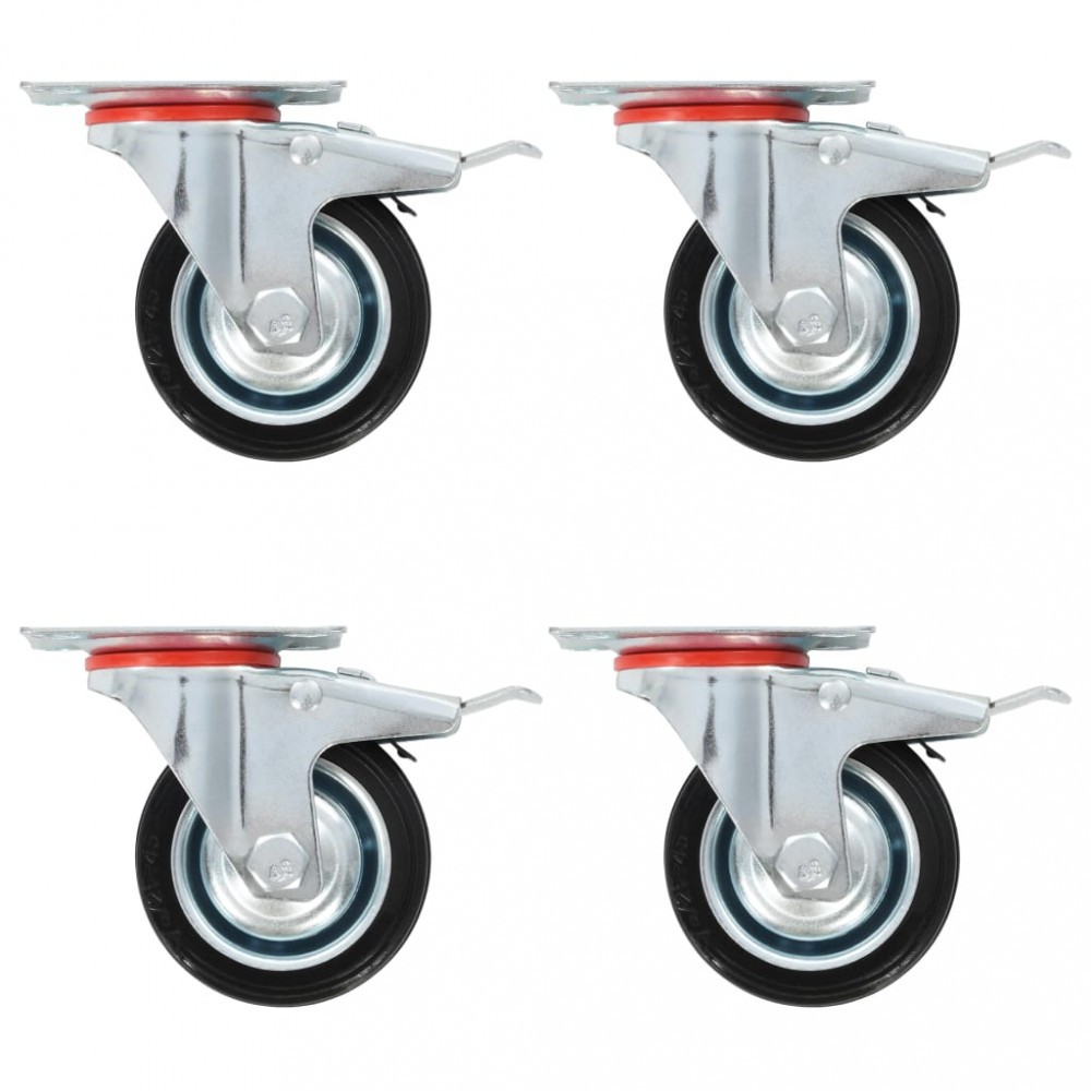 Aceste roti sunt fabricate din cauciuc, care se remarca printr-o buna rezistenta la socuri si vibratii, permitand rotilor sa functioneze lin si silentios. In plus, suprafetele lor moi protejeaza eficient podeaua impotriva zgarieturilor. Pe langa aceasta, cadrul de fier zincat este rezistent la rugina si adauga, astfel, un plus de robustete si durabilitate rotii. Aceste roti pivotante sunt echipate cu frane duble pentru un control flexibil. Fiecare roata poate suporta o greutate maxima de pana la 50 kg.