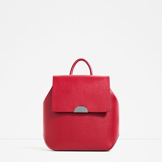 Rucsac ZARA de culoare rosie. Detaliu elemente din metal argintii pe capac. Mâner de mâna si bretele ajustabile. Buzunar interior. Închidere prin intermediul unui magnet si al unei barete la interior. Înaltime x latime x adâncime: 30 x 28 x 12 cm
