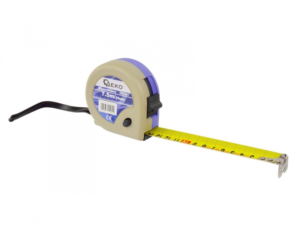 Banda de oțel carbon are un cârlig de măsurare solid. Carcasa cupei de măsurare este realizată din plastic ABS. Scara netedă și lizibilă facilitează citirea măsurătorilor. Buton de blocare acționat cu degetul mare.. Caracteristicile produsului. ușor și la îndemână. bandă din oțel carbon. buton de blocare a benzii. scară lină și lizibilă. cârlig de măsurare solid. Carcasă din plastic ABS. Date tehnice. Lungimea centurii: 7,5 m. Lățimea benzii: 25 mm. Grosime bandă: 0,115 mm. Funcția de blocare a benzii: da. Capac de cauciuc: nr. Funcția de blocare automată a benzii [autolock]: nr