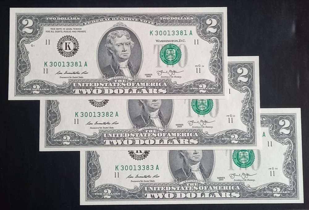 S.U.A., 3 x 2 Dolari 2013, UNC, Consecutive.