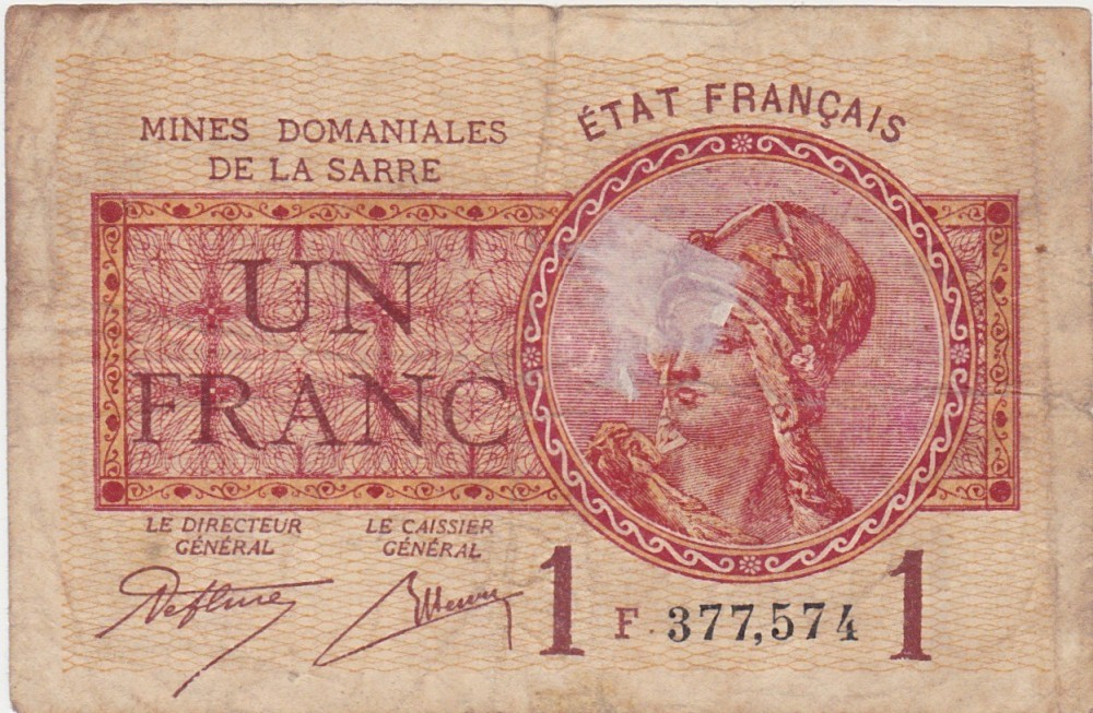 SAAR 1 Franc MINES DOMANIALES DE LA SARRE FRANCE 1919 aF