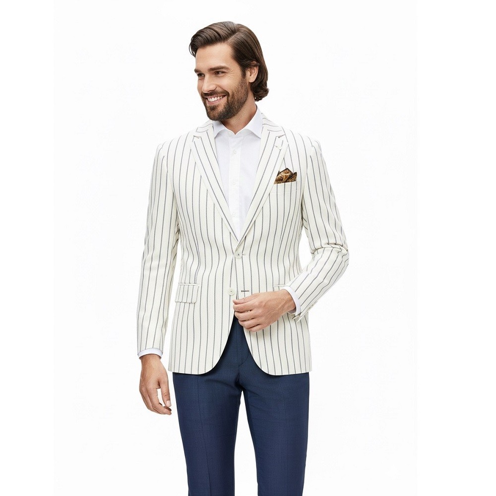 Sacoul alb cu dungi gri este piesa ideală pentru bărbatul care vrea să iasă în evidență cu eleganță și prospețime. Cu o croială slim, îmbină rafinamentul liniilor clasice cu un aer modern, oferind o apariție impecabilă. Materialul conferă confort și structură, făcându-l potrivit pentru evenimente sofisticate, cocktailuri sau ținute de vară elegante.