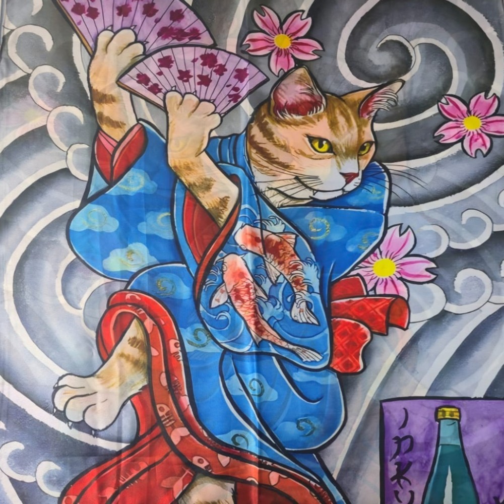 Salul elegant Lucky Cat voal din vascoza si poliester 70×180 cm este accesoriul perfect pentru un look artistic, modern si plin de personalitate. Realizat dintr-un material usor, fin si fluid, acest sal impresioneaza prin imprimeul spectaculos: o pisica stilizata in motive asiatice, inconjurata de nuante vibrante de albastru, rosu, mov si gri.