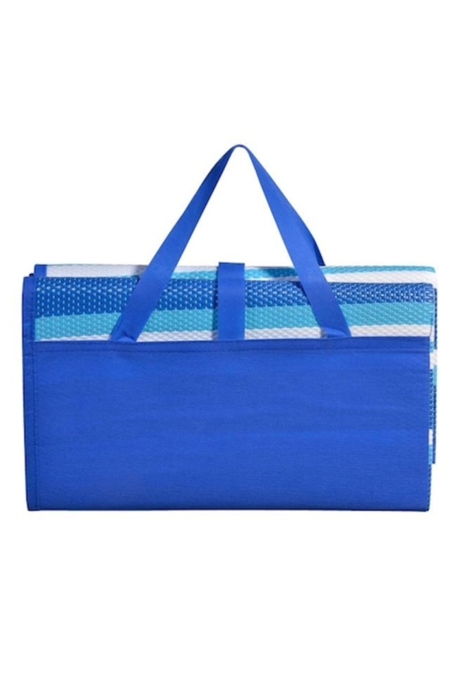 Covoraș de plajă durabil, cu strat dublu, fabricat din plastic, cu un model simplu cu dungi de vară în culorile alb și albastru.; Vine într-o pungă cu șnur pentru o portabilitate ușoară.; Țesătura densă previne trecerea nisipului.