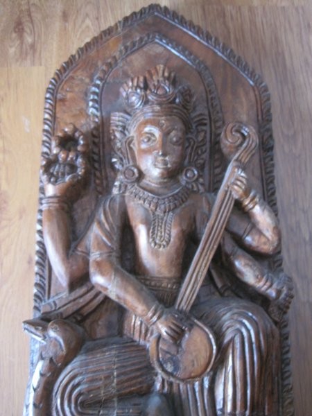 Saraswati ( sanscrită: सरस्वती, Sarasvatī ) este zeița hindusă a cunoașterii, a muzicii, a artelor, a înțelepciunii și a învățării adorate în Nepal și India. Ea face parte din trinitatea ( Tridevi ) din Saraswati, Lakshmi și Parvati . Toate cele trei forme ajută trinitatea lui Brahma, Vishnu și Shiva de a crea, întreține și regenera-recicla Universul respectiv . Sculptata in lemn masiv exotic de esenta tare . Dimensiuni 73 X 29 X 10 cm . Greutate 10 kg . Fotografii mai multe la cerere .