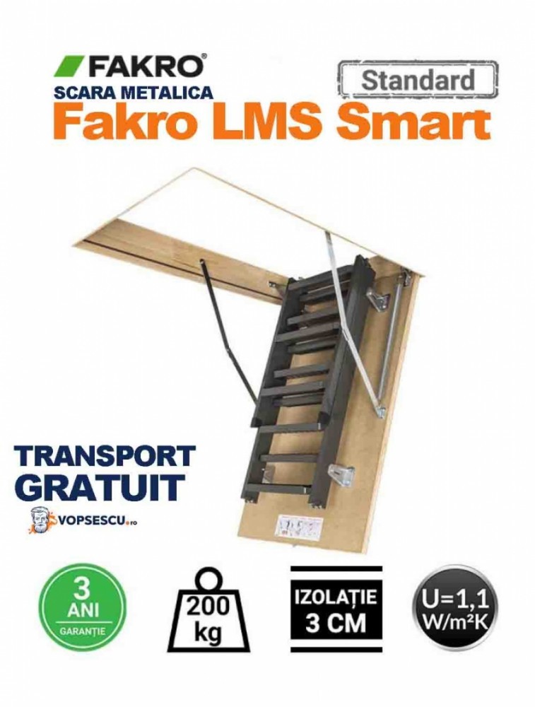 LMS Smart este scara modulara metalica alcatuita din 3 parti pliabile, cu usa termoizolanta tip sandwich si toc fabricat din lemn de pin. Nu contine maner de protectie. Acesta poate fi comandat ulterior. vanguri telescopice cu mansoane de protectie usa finisata în alb sipca metalica ornament garnitura periferica ce asigura etansarea pe întreg perimetrul tocului trepte cu striatii antiderapante, iesite în afara liniei vangurilor mâner telescopic de sprijin sistem pentru montaj rapid posibilitatea instalarii de accesorii suplimentare asamblate din fabrica si pregatite pentru montaj simplu si rapid în structura tavanului 3 ani garantie