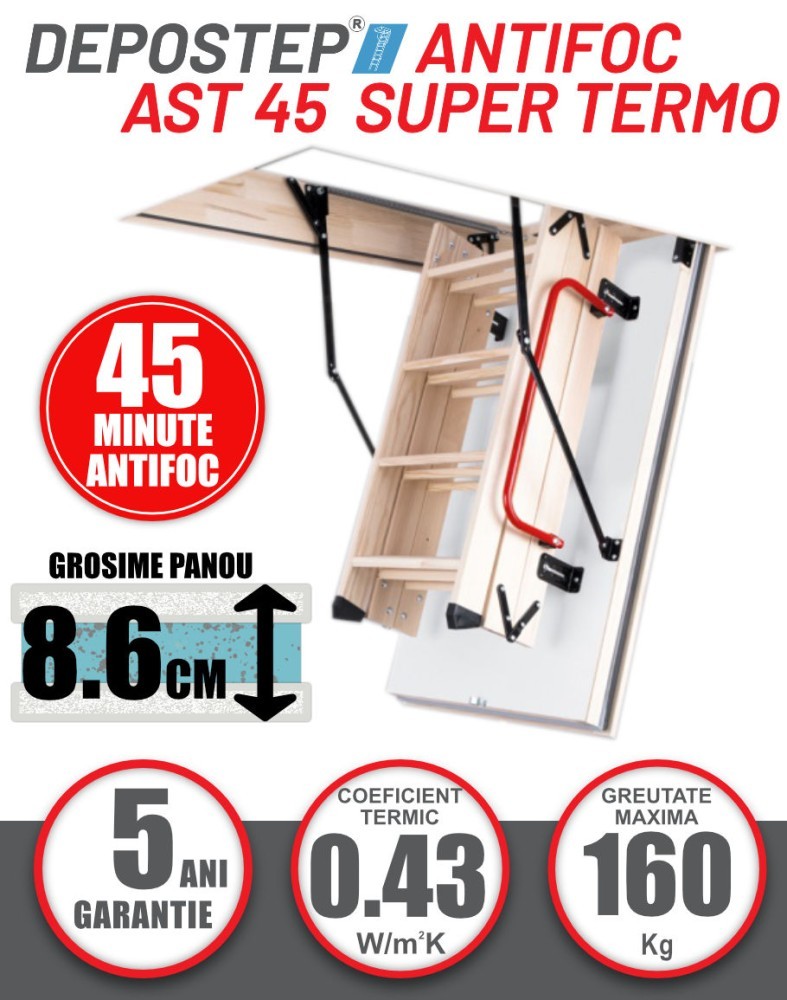 Scara pod antifoc DEPOSTEP AST 45 SUPER TERMO – 3 garnituri de etansare, coeficient termic 0. 43 W/m2k DEPOSTEP ANTIFOC AST 45 SUPER TERMO este o scara de pod din lemn de calitate superioara, proiectata special pentru a oferi atat o izolare termica excelenta, cat si protectie eficienta impotriva incendiilor. Este solutia ideala pentru spatii unde se doreste controlul pierderilor de caldura si siguranta in fata riscurilor de foc. Rezistenta la foc – 45 de minute (certificare EI45) Scara este echipata cu o usa termoizolatoare ignifuga, certificata EI45, capabila sa previna propagarea flacarilor si fumului timp de pana la 45 de minute. Capacul are o grosime impresionanta de 8, 6 cm, oferind o bariera solida intre etaje. Etansare si izolatie termica de inalta performanta Sistemul de etansare este format din 3 garnituri perimetrale, dintre care una este garnitura antifoc expansiva. Acestea asigura o izolare completa, impiedicand atat pierderile de caldura, cat si patrunderea fumului sau gazelor fierbinti in caz de incendiu. Cu un coeficient de transfer termic de doar 0, 43 W/m²K, aceasta scara este una dintre cele mai eficiente optiuni pentru locuinte sau cladiri care doresc eficienta energetica ridicata. Aplicatii recomandate ✔️ Incaperi expuse riscului de incendiu ✔️ Spatii neizolate sau cu pierderi de caldura ✔️ Zone unde este necesara o bariera termica si ignifuga combinata Beneficiile modelului AST 45 SUPER TERMO ✅ Capac termoizolant gros de 8, 6 cm ✅ 3 garnituri de etansare pentru protectie termica si antifoc ✅ Rezistenta la foc de 45 minute – clasa EI45 ✅ Coeficient de izolatie termica: 0, 43 W/m²K ✅ Fabricata din lemn de pin de inalta calitate DEPOSTEP ANTIFOC AST 45 SUPER TERMO este alegerea ideala pentru cei care doresc sa combine siguranta impotriva incendiilor cu o izolare termica excelenta – un produs complet, eficient si durabil. Caracteristici tehnice: scara modulara metalica compusa din 3 sectiuni;usa super termoizolanta rezistenta la foc finisata in alb pe ambele parti;clasa EI45 de rezistenta la focimpiedica pentru 45 de minute raspandirea flacarilor la etajul superior;3 garnituri periferice din care 1 rezistenta la foc;cea mai inalta clasa de etansare: clasa 4 recomandata in special in constructiile unde se urmareste sa se obtina o eficienta energetica ridicata precum ar fi casele pasive;maner de sustinere cu posibilitate de montaj pe partea dreapta sau stanga a scarii;trepte cu striatii antiderapante;treapta aditionala in partea superioara pentru un acces usor si confortabil;mansoane pentru protectia podelei incluse;coeficient de transmitanta termica: 0. 43 W/m2Kgrosimea usii: 8. 6 cm;grosimea izolatiei: 8 cm;inaltimea tocului: 17 cm;latimea scarii: 40 cm;latimea treptei: 35. 8cm;adancimea treptei: 8 cm;sarcina maxima: 160kg;posibilitatea de a instala accesorii suplimentare;garantie: 5 ani;