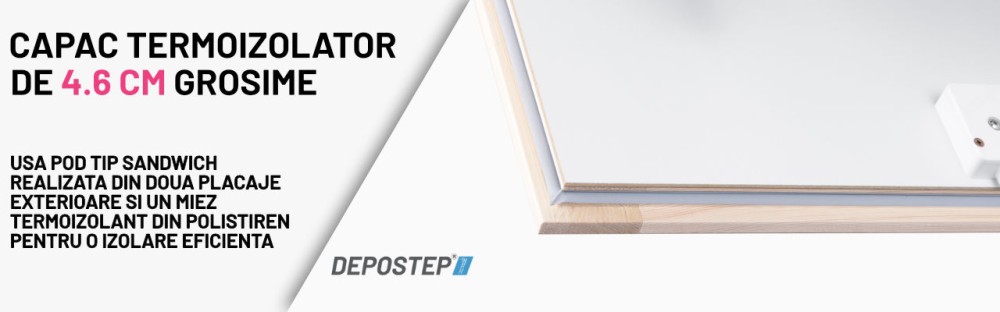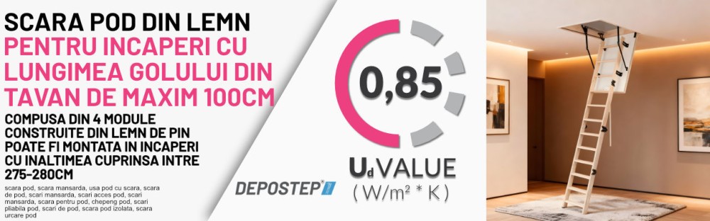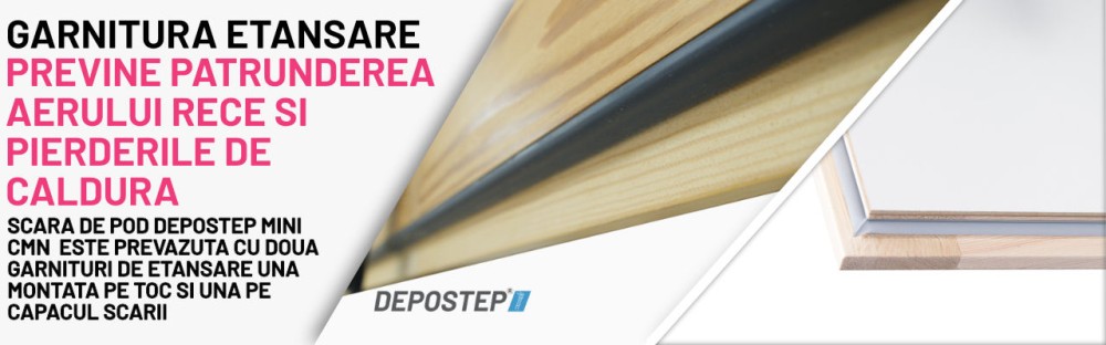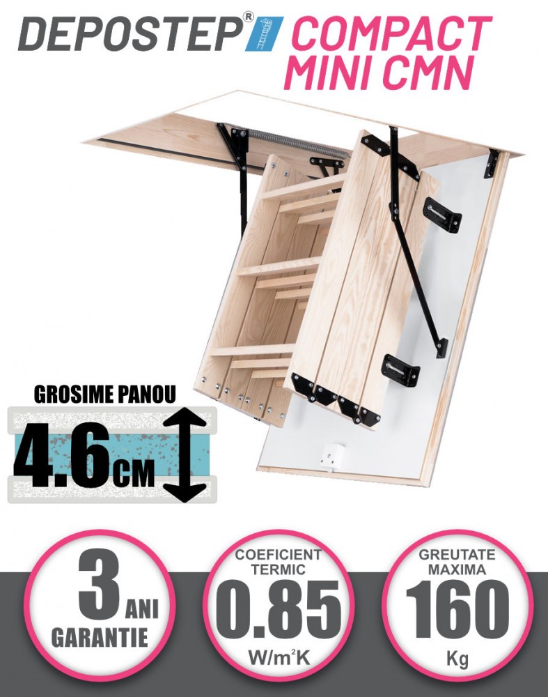 SCARA POD DEPOSTEP COMPACT MINI CMN este solutia ideala pentru incaperi cu goluri mici in tavan, unde nu se pot instala scari cu tocuri lungi. Realizata din lemn de pin de cea mai buna calitate, aceasta scara modulara pe 4 sectiuni ofera confort, siguranta si o buna eficienta termica datorita capacului termoizolator de 4.6 cm (izolatie 4 cm) si garniturilor duble de etansare.