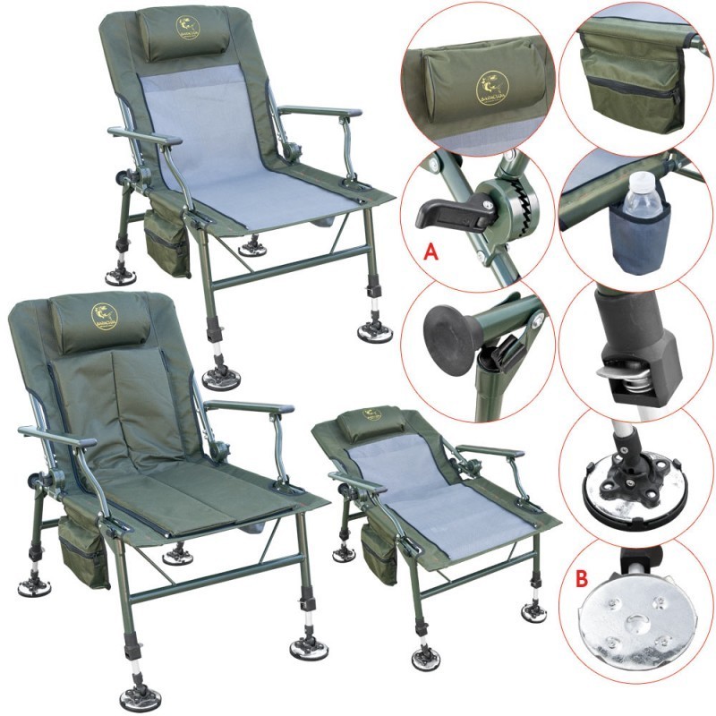 Scaun pentru pescuitul la crap cu spătar reglabil, cu cotiere și picioare ajustabile (poziționarea șezutului scaunului față de pământ variază între 36cm-45cm).