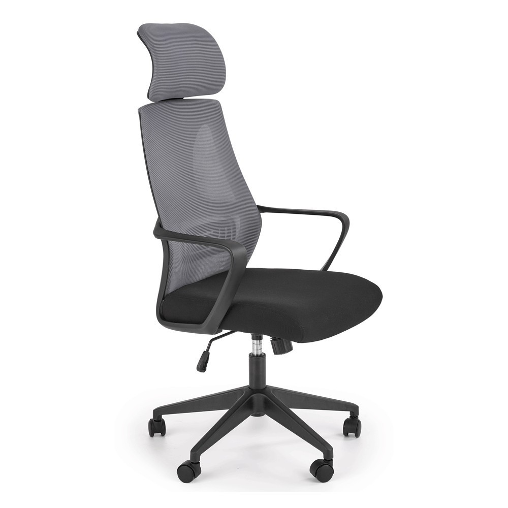 Scaun birou cu mesh HM Valdez, mecanism de balans, cadru polipropilena, suport lombar, tetiera inclusa, roti pivontante, 100 kg, negru gri