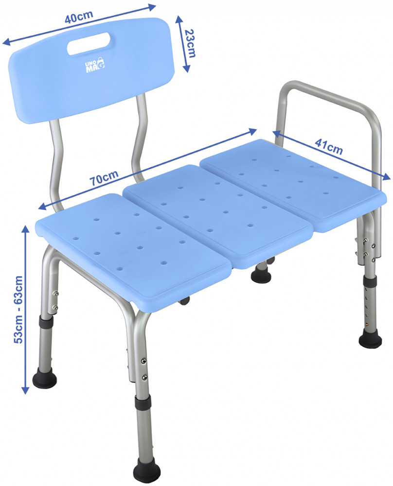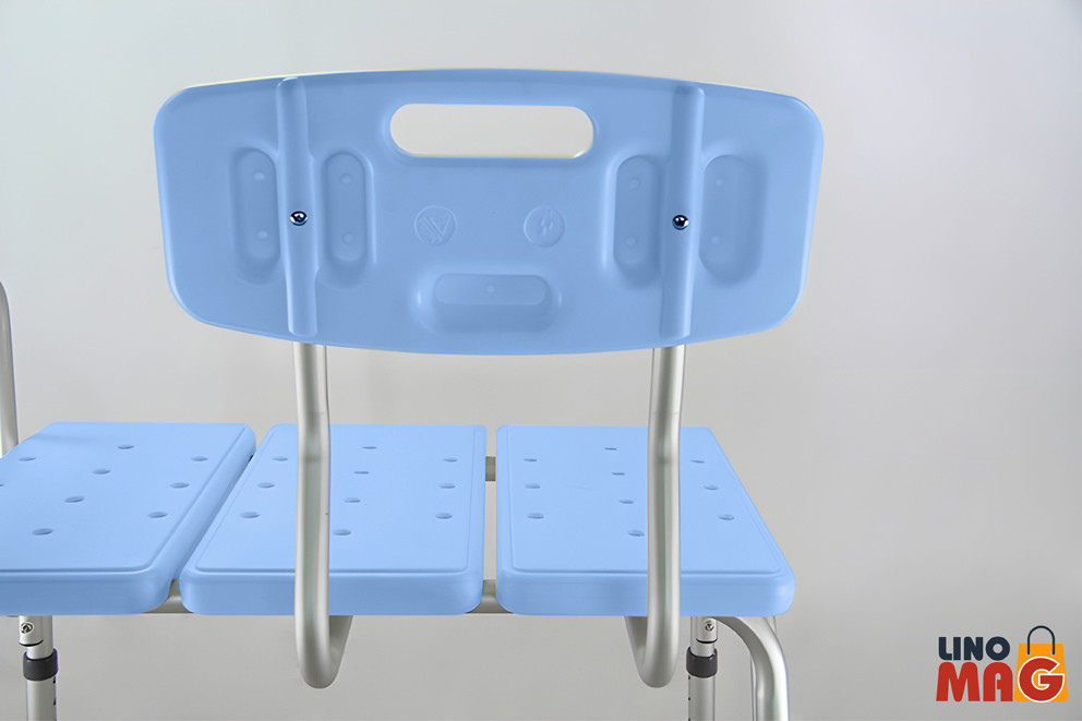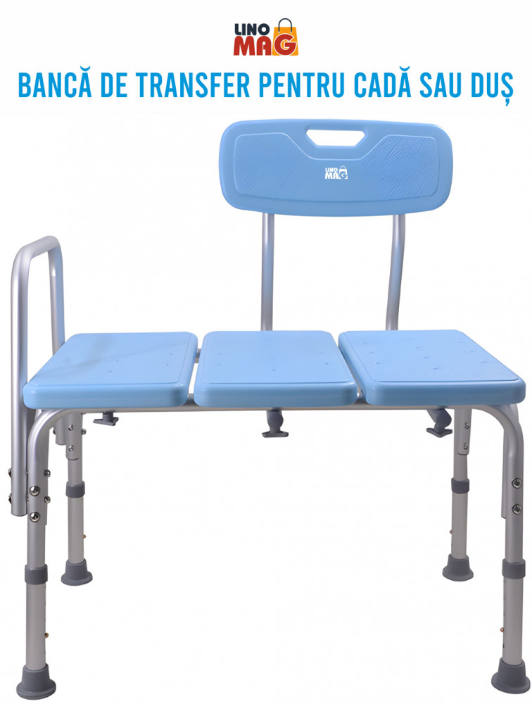Scaun de baie tip banca pentru transfer cada sau dus, Linomag®, Inaltime ajustabila, Cu spatar si maner interschimbabile stanga/dreapta, Albastru desc