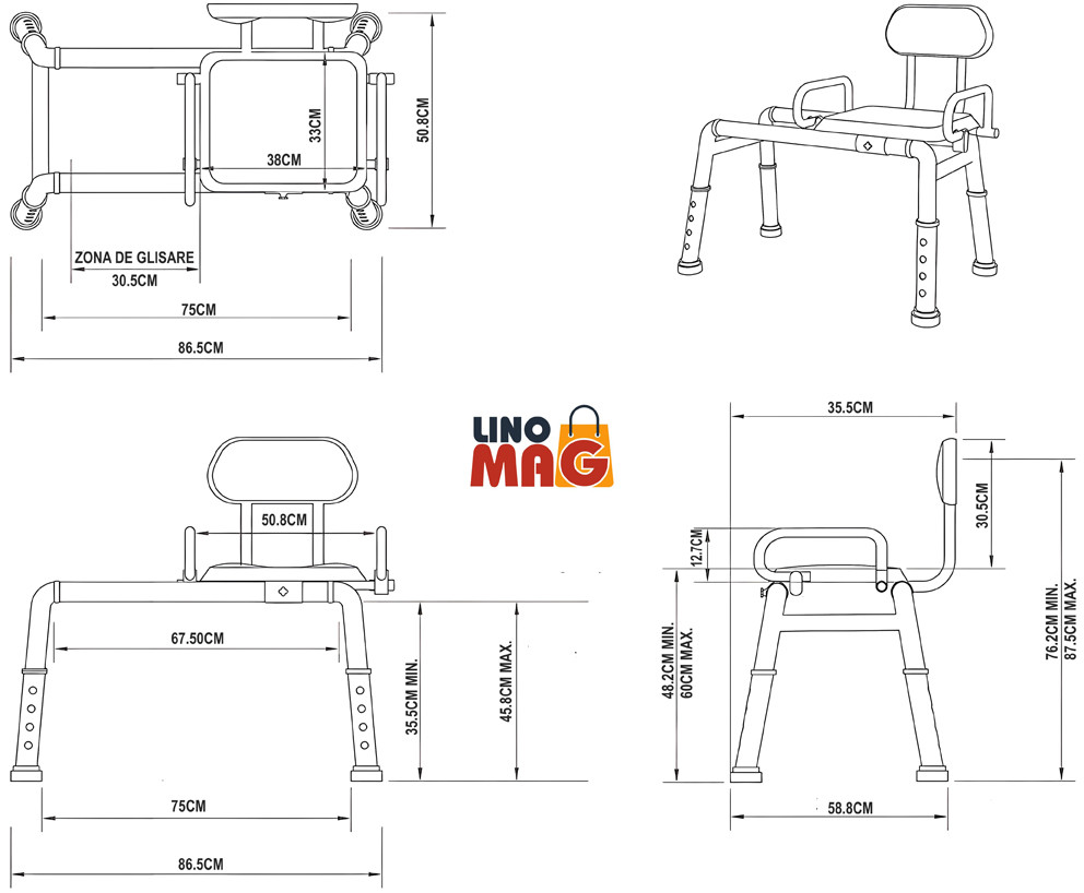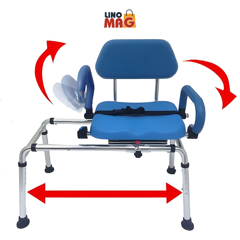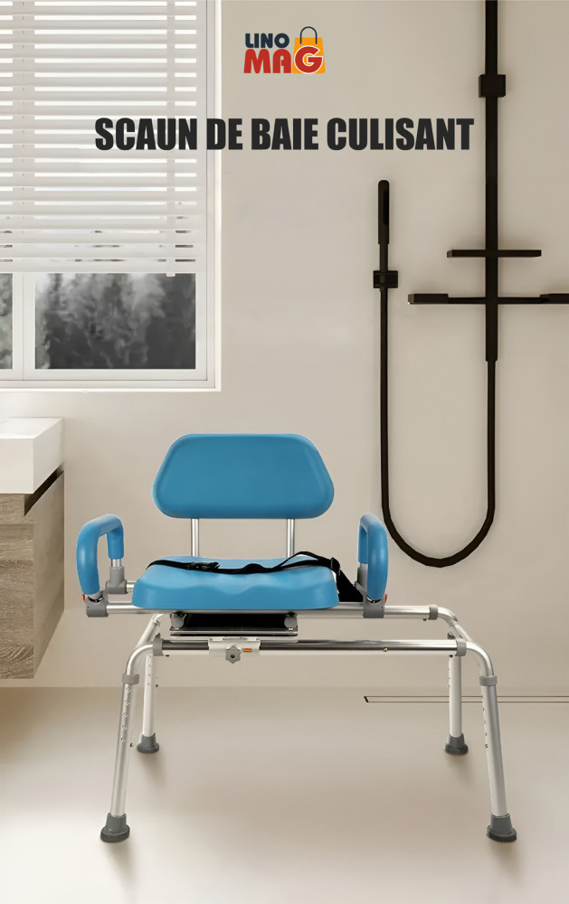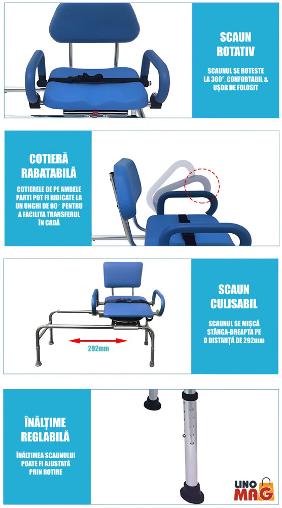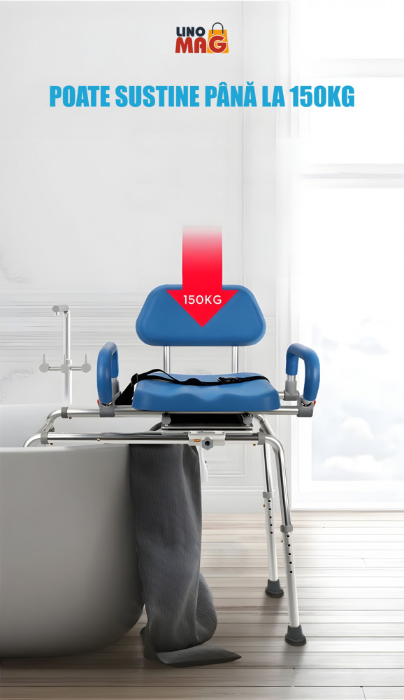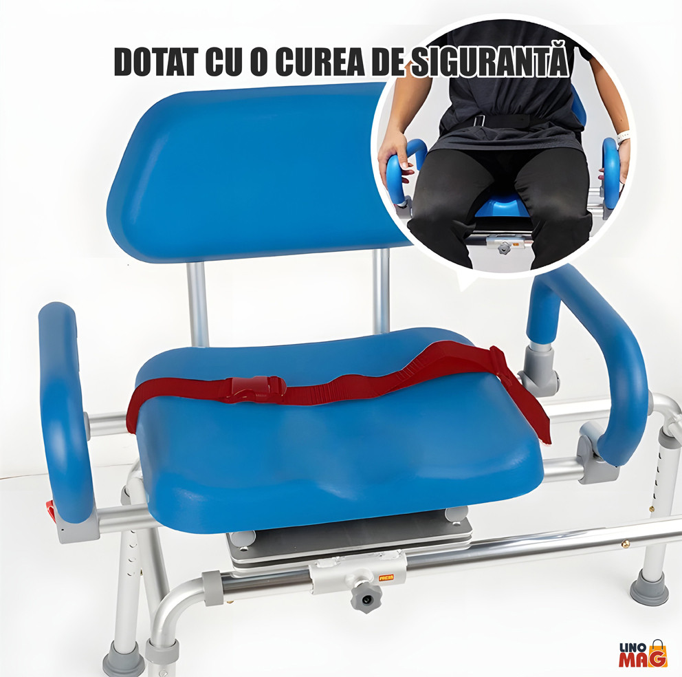 Scaun glisant de baie pentru transfer cada sau dus, Linomag®, Rotativ, Manere rabatabile, Gliseaza stanga/dreapta, Inaltime reglabila, Impermeabil, Se