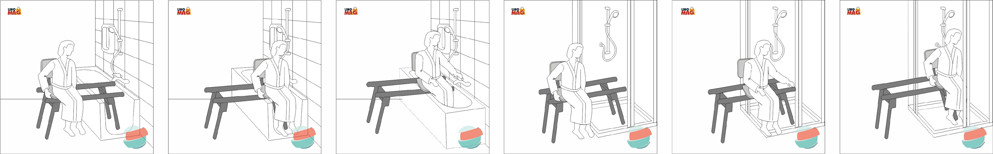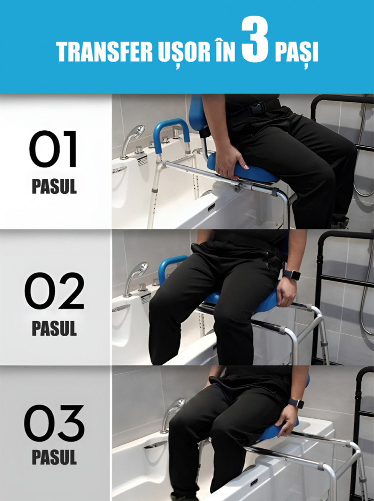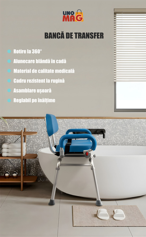 Banca de transfer facilitează transferurile în baie ale utilizatorilor cu mobilitate redusă. Are un scaun glisant și rotativ la 360° pentru a permite transferul în siguranță, depășind marginea căzii sau denivelările plăcii de la duș datorită reglării pe înălțime a șezutului. Cele patru picioare de susținere, acoperite cu cauciuc antiderapant, sunt reglabile independent. Scaunul și spătarul sunt ușor conturate, au o suprafață antiderapantă și asigură confortul datorită compoziției din cauciuc.