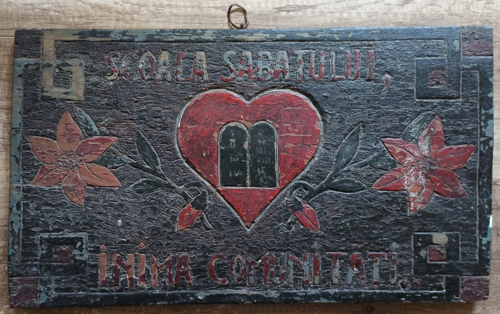 Scoala Sabatului, inima comunitatii// placa din lemn cioplita, interbelica
