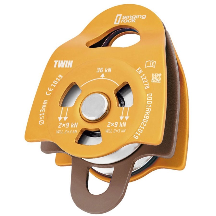 Scripete dublu de înaltă rezistență și eficiență – Singing Rock Twin. Scripete durabil și ușor, proiectat și optimizat pentru utilizare cu nodul Prusik. Punctul de prindere acceptă până la trei carabiniere Rulmenți cu bile și diametru mare al roții pentru eficiență maximă Diametrul roții: 48 mm Punct de prindere inferior: 12 kN Compatibil cu corzi statice și dinamice Număr unic de fabricație Greutate: 421 gRezistență: 36 kNDiametru maxim coardă: 13 mmRulment: cu bileSarcină de lucru: 4 × 3 kN Material (roată): aliaj ușor