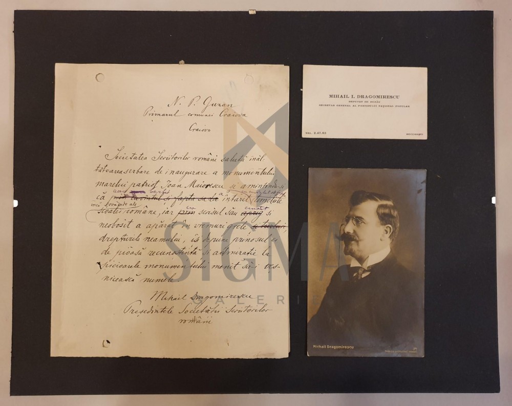 LOT FORMAT DINTR O SCRISOARE, SEMNATA MIHAIL DRAGOMIRESCU ( SOCIETATEA SCRIITORILOR DIN ROMANIA ) SALUTAND PRIMARUL URBEI CRAIOVA, N. P. GURAN PENTRU INAUGURAREA STATUII LUI IOAN MAIORESCU DIN CRAIOVA. SCRISOARE SCRISA SI SEMNATA DE MIHAIL DRAGOMIRESCU, CARTE DE VIZITA, FOTO TIP CARTE POSTALA, TOATE UNTR UN MONTAJ CU GEAM. *Mihail Dragomirescu (n. 22 martie 1868, Plătărești, Călărași - d. 25 noiembrie 1942, București) a fost un estetician, teoretician și critic literar român. *Ioan Maiorescu, născut Trifu, (n. 1811, Bucerdea Grânoasă, Bucerdea Grânoasă, Alba, România – d. 24 august/5 septembrie 1864, Craiova, Principatele Unite) a fost un profesor român de istorie, director al Școlii Centrale din Craiova, agent diplomatic al guvernului Țării Românești pe lângă dieta germană de la Frankfurt pe Main, tatăl lui Titu Maiorescu. Deși lucrarea a fost terminată în 1911, inaugurarea a fost amânată până în ziua de 7 ianuarie 1913, când profesorii craioveni N. Bănescu și Vasile Mihăilescu au finalizat volumul omagial dedicat marelui profesor de istorie.