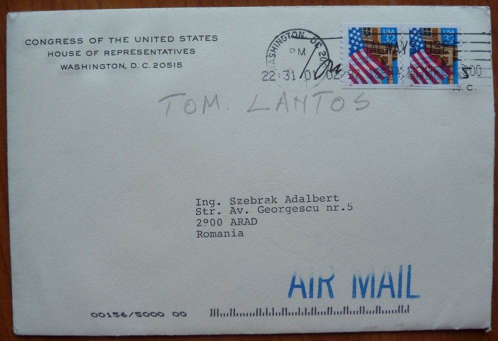 D 4. Scrisoarea de felicitare are antetul Congresului Statelor Unite si este insotita de plicul original. Thomas Peter "Tom" Lantos (1928 - 2008) a fost un politician democrat al Camerei Reprezentanților din California, din 1981 până la moartea sa. De origine maghiara, Lantos a fost singurul supravietuitor al Holocaustului care au servit în Congresul Statelor Unite. În 2008, după moartea sa, Comisia pentru Drepturile Omului, pe care a fondat-o în 1983, a fost redenumit Comisia pentru Drepturile Omului Tom Lantos. În 2011, Institutul Tom Lantos a fost înființat la Budapesta pentru a promova toleranța și să sprijine problemele minoritătilor. Este un autograf important pentru un colectionar de autografe ale personalitatilor mondiale.