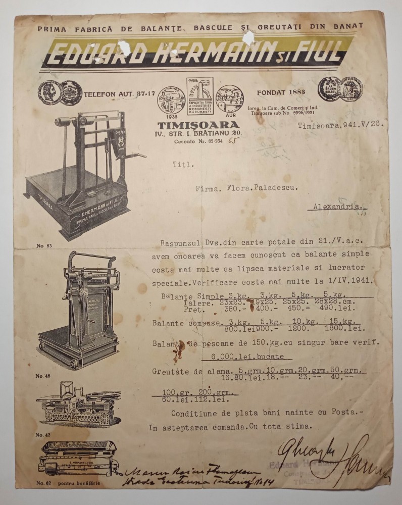 Scrisoare Eduard Hermann si fiul fabrica de balante cantare Timisoara Banat 1941