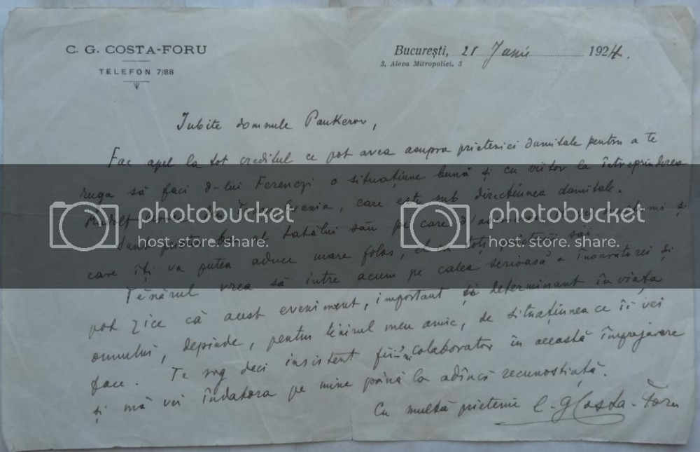 D4. Scrisoare olografa a lui Constantin Costa Foru, datata 1924, aroman, fondator al Ligii Drepturilor Omului si al organizatiei Cercetasii Romaniei. Format 1/2 din A4. Constantin Gheorghe Costa-Foru (n. 26 octombrie 1856, București - d. 15 august 1935) a fost un jurnalist român, avocat și activist pentru drepturile omului. Născut în București, la 26 octombrie 1856. Tatăl său, Gheorghe Costa-Foru (1820-1876), a fost un politician de succes, de două ori ministru, și primul rector al Universității din București. Familia a avut origini aromâne, fiind originar din orașul Larissa, în Tesalia. În 1740 s-au stabilit în București, unde au acumulat avere considerabilă, construind un conac în Popești-Leordeni și o reședință de vară în Berca. Costa-Foru a studiat la Heidelberg, apoi la Colegiul Sainte-Barbe "din Paris, și în jurul anului 1872 în Dresda. După terminarea studiilor s-a întors la Paris, unde s-a căsătorit cu Maria Ion Paspatti (1872-1935) pe 26 iunie 1893. Cuplul a avut 10 copii. Împreună cu un grup de profesori, ofițeri, ziariști, oameni de litere și politicieni a ajutat la pornirea mișcării de cercetași din România și la dezvoltarea organizației Cercetașii României. Constantin Costa-Foru a fost un susținător vocal al drepturilor omului, și a acuzat anti-semitismul în perioada post-război mondial. În 1929 el a fost unul dintre fondatorii a Ligii Drepturilor Omului, lucrând în calitate de secretar al Ligii. În memoria sa și a tatălui său, două străzi din Bucuresti sunt numite după numele lor.