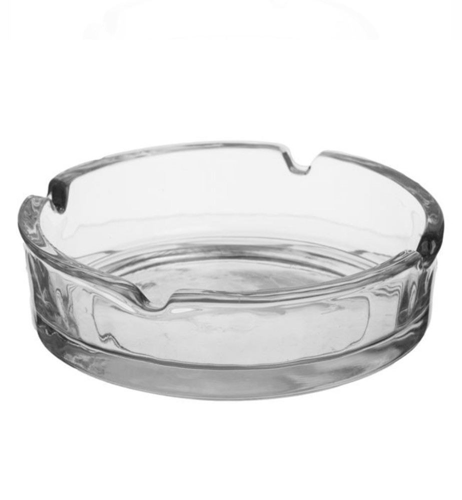 Scrumiera rotunda din sticla transparenta, cu 4 spatii pentru tigari.