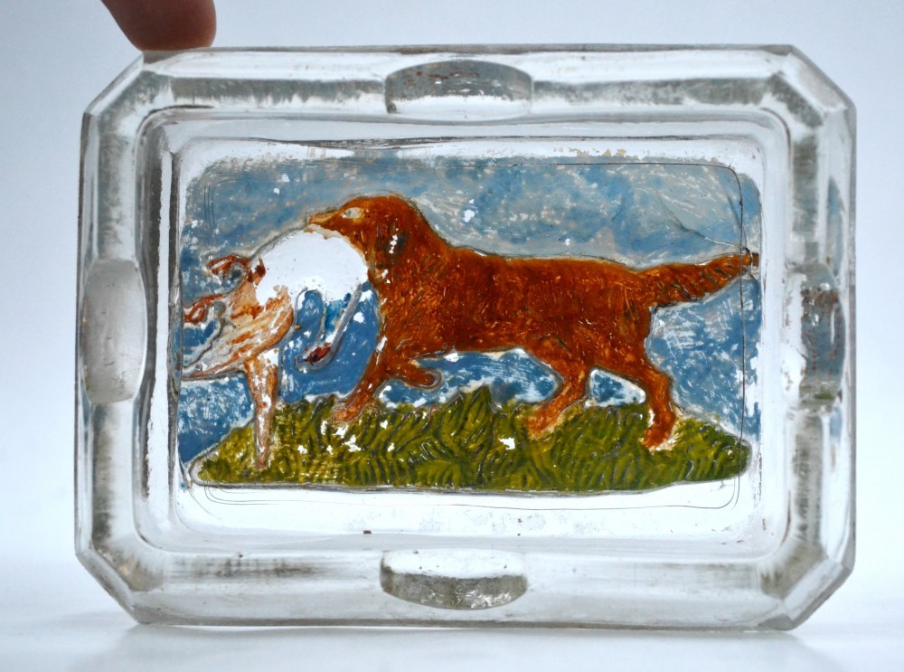 Scrumiera veche din sticla perioada Art Nouveau - scena vanatoare - caine si rata