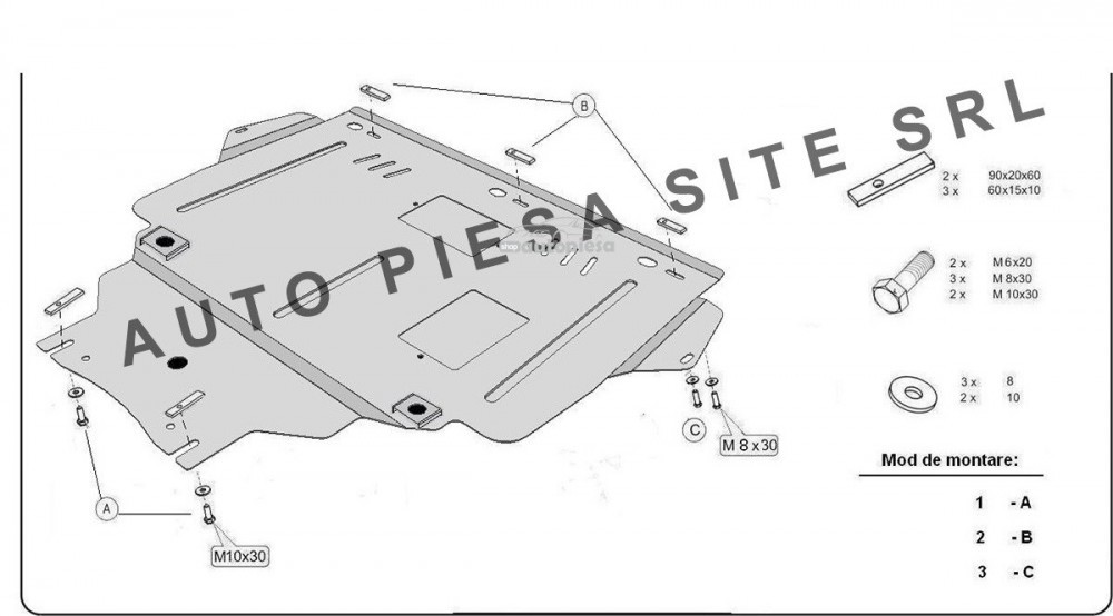 Se livreaza impreuna cu suruburi, piulite, cleme si toate accesoriile pentru montare si nu necesita modificari ulterioare pentru a putea fi montat pe masina. Imaginile produselor sunt cu titlu informativ. In functie de model, scutul contine traverse, urechi de prindere, suruburi, etc., cat si instructiuni de montaj.