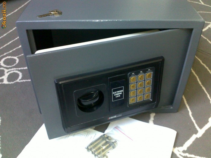 Seif electronic pt bani, acte etc. Dimensiune 170/270 mm (inaltime/latime). Functioneaza electronic (4 baterii LR20), sau cu cheie. Accesorii: 2 chei, 4 dibluri pt sarcini grele, cu piulite, saibe pt prindere in perete, 1 suport din pasla in interior, manual de folosire. Produsul este ca si nou, nu a fost folosit.