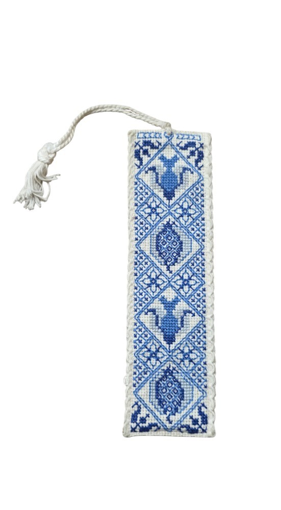Semn de carte vintage, lucrat și cusut manual în cruciulițe cruciulițe pe etamină mica. Cusut în nuanțe de albastru, dispuse în motive geometrice și florale, iar marginea este finisată atent, completată de un ciucure textil.