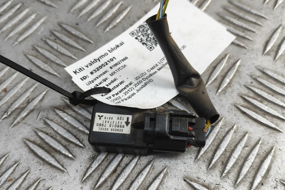 Senzor de impact stânga față ISUZU D-MAX I TFR, TFS . OEM: 8980137960 . Aceasta este o piesă originală de la producător, asigurând calitatea și compatibilitatea cu vehiculul dumneavoastră. . Expediem în siguranță din depozitele noastre din Europa Centrală și de Nord, folosind soluții logistice de încredere. Suntem cel mai mare depozit de piese auto din dezmembrări din Europa de Nord, oferind o gamă largă de piese second-hand precum motoare, baterii pentru vehicule electrice, cutii de viteze etc. Gama noastră include piese pentru BMW, Mercedes-Benz, Audi, VW, Seat, Toyota, Lexus, Tesla, Nissan, Peugeot, Citroen, Renault, Land Rover, Jaguar și alte mărci auto. Oferim garanție pentru piese originale și politică de retur. Când ne sunați, vă explicăm condițiile de garanție pentru fiecare caz în parte și organizăm livrarea folosind logistică modernă. Piesele uzate sunt acoperite de garanție.