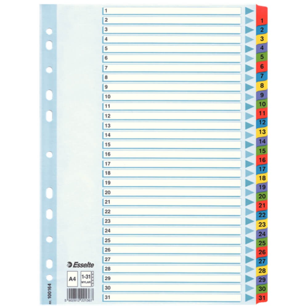 Separatoare Index din Carton Esselte Mylar, A4, Tip Index 1-31, Taste Laminate, Multicolor, Separator Index, Separatoare Carton Index, Separatoare Ess