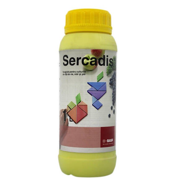 Fisa de securitate: Click aici Mod de actiune: Substanta activa, Fluxapiroxad, face parte din grupa fungicidelor cunoscute ca SDHI – inhibitori ai succinat dehidrogenazei si actioneaza la nivel molecular, inhiband puternic germinarea sporilor, elongarea tubului germinativ, cresterea miceliului si sporularea (toate stadiile principale ale cresterii si reproducerii ciupercii in dezvoltarea bolilor). Fluxapiroxad blocheaza producerea de energie a agentului patogen, mai specific, intrerupe functionarea normala a enzimei succinat dehidrogenaza (sau Complexul II al ciclului lui Krebs), intrerupand lantul respiratiei mitocondriale. Este o substanta unica in clasa sa, deoarece are un mod unic de actiune: moleculele sale pot lua conformatii atat lipofile, cat si hidrofile, adaptandu-se rapid si trecand cu usurinta de barierele membranare. Mai mult, substanta activa se fixeaza puternic pe stratul ceros al frunzei, iar moleculele sale incep sa se uneasca, formand cristale ce adera ferm la stratul ceros. Roua sau precipitatiile mobilizeaza mici parti ale substantei active din depozitele de pe suprafata frunzei, asigurand astfel redistribuirea intensa a depozitelor de Fluxapiroxad, deci o protectie prelungita si de incredere. Determina atat raspandirea substantei active pe suprafata frunzei, cat si absorbtia in stratul ceros si in tesutul acesteia. Avantajele utilizarii fungicidului Sarcadis: Proprietati unice de redistribuire a substantei active pentru protectie de lunga durata; Eficacitate excelenta in combaterea fainarii si rapanului; Mobilitate unica si actiune translaminara; Acoperire excelenta pentru o buna protectie a culturii; Performanta sustinuta in conditii climatice dificile; Fereastra larga de aplicare; Selectivitate ridicata fata de cultura; Uscare rapida dupa aplicare si rezistenta foarte buna la spalare; Flexibilitate pentru personalizarea programului de tratamente; Protectie de incredere si in conditii climatice dificile; Compatibilitate ridicata; Nu influenteaza procesul de vinificatie, compozitia mustului si vinului, sau calitatile organoleptice ale vinului. Mod de utilizare: Sercadis se aplica ca tratament preventiv in plantatiile de vita de vie si pomi fructiferi. Vita de vie - se pot aplica maxim 3 tratamente, la un interval minim de 10 zile intre tratamente, pe perioada de vegetatie BBCH 11-83, respectiv de la aparitia primei frunze nedesfacute si pana la momentul in care boabele dezvolta culoarea specifica. Pomi fructiferi (mar, par) - pot fi aplicate maximum 3 tratamente, la un interval minim de 7 zile intre tratamente, pe perioada de vegetatie BBCH 53-81, respectiv de la buton: frunzele verzi acopera petalele florii vizibile si pana la inceputul coacerii fructelor (aparitia culorii specifice). Timp de pauza: 35 zile. Numar de tratamente pe an: 3 tratamente. Intervalul de timp minim intre aplicari: 10 zile pentru vita de vie, 7 zile pentru pomi fructiferi. Se recomanda utilizarea volumului de solutie cuprins intre 500-1500 litri/ha pentru pomi fructiferi si 200-1000 litri/ha pentru vita de vie. Volumul de solutie utilizat este inflentat de cultura si de echipamentul folosit. Pentru combaterea rezistentei rapanului din plantatiile de pomi fructiferi, se recomanda utilizarea in amestec in rezervor a dozei minime omologate a produsului Sercadis, impreuna cu un fungicid de contact partener.
