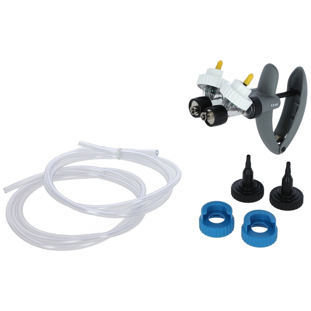 Se poate folosi atât cu flacoane (Ø 20 mm și Ø 30 mm), cât și cu furtunuri (Ø 4–6 mm). Seringa este livrata cu toate accesoriile necesare: adaptoare pentru flacoane, adaptoare pentru furtunuri și tuburi din PVC.