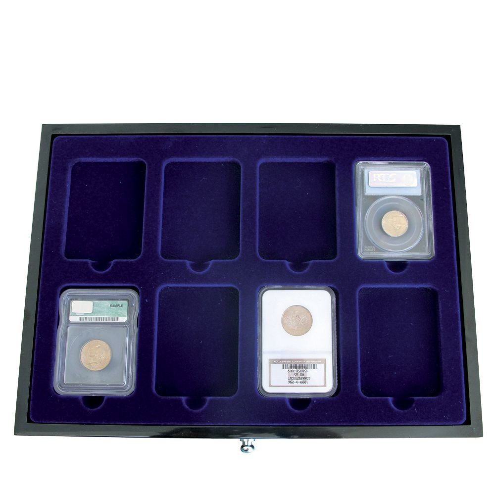 Sertar cu insertie de catifea albastra pentru 8 monede in capsule slabs. Lemn acoperit in lac de pian. Sertarul are o inaltime 25 mm. Pentru cutia de lemn, Black Lacquer, 6590 6591.
