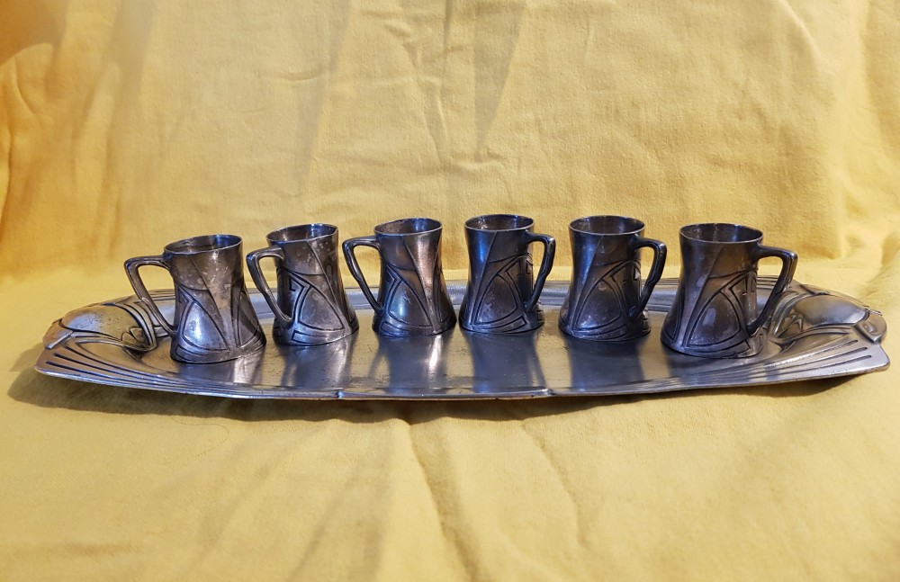 Srrviciu din metal argintat pentru servit lichior-jugendstil-germania cca 1900-1910-tavita +6 cescute-dimensiuni tava 37x15 centimetri-inaltime cescute 5 centimetri-toate piesele prezinta semne de uzura-rog apreciere dupa fotografii.