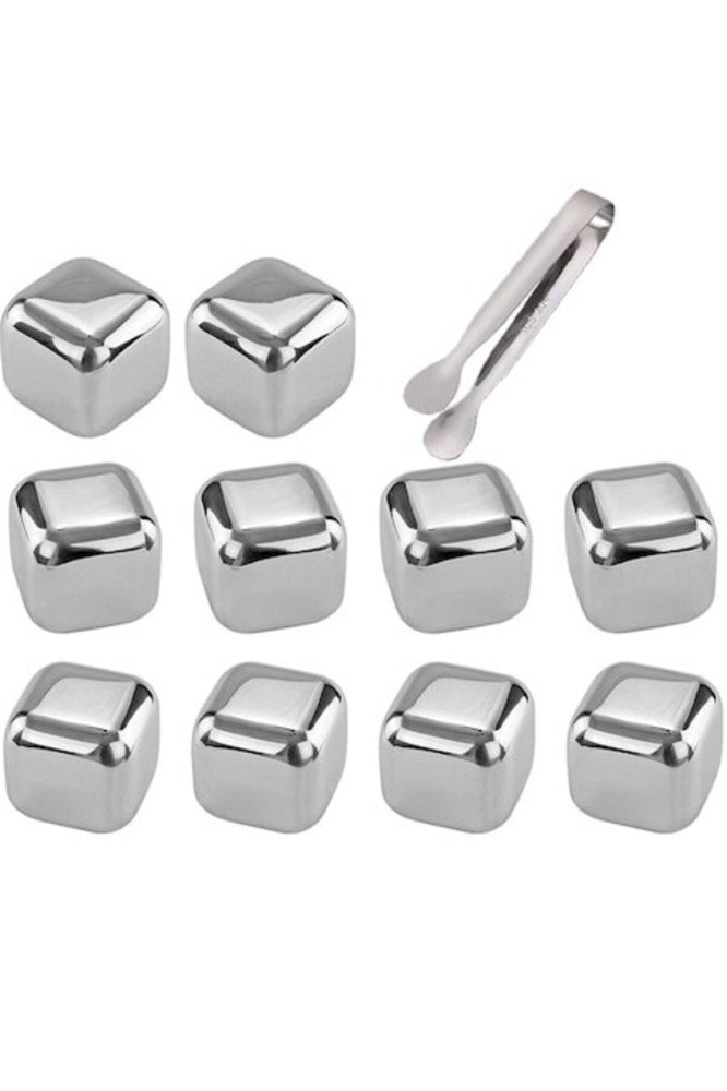 Cuburi de gheață reutilizabile din oțel inoxidabil, ideale pentru răcirea băuturilor fără diluare.; Include 10 cuburi de formă cubică din oțel inoxidabil alimentar.; Vine cu o clemă pentru manipulare.; Netoxic și se poate spăla în mașina de spălat vase.; Fiecare cub măsoară 2,7x2,7x2,7 cm.; Nu este potrivit pentru copii din cauza pericolului de sufocare.; Alternativă la cuburile de gheață tradiționale.