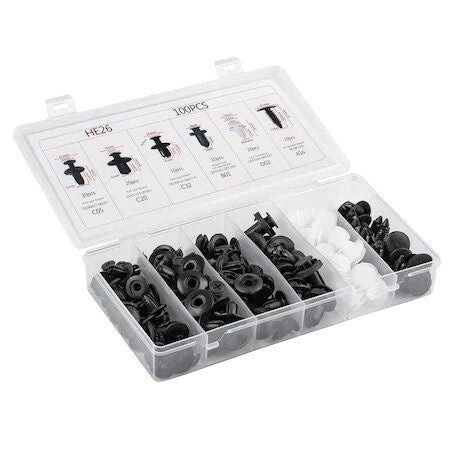Set universal de 100 de piese diverse cleme auto pentru fixarea tapitereriei in masina, aripi, bare de protectie.