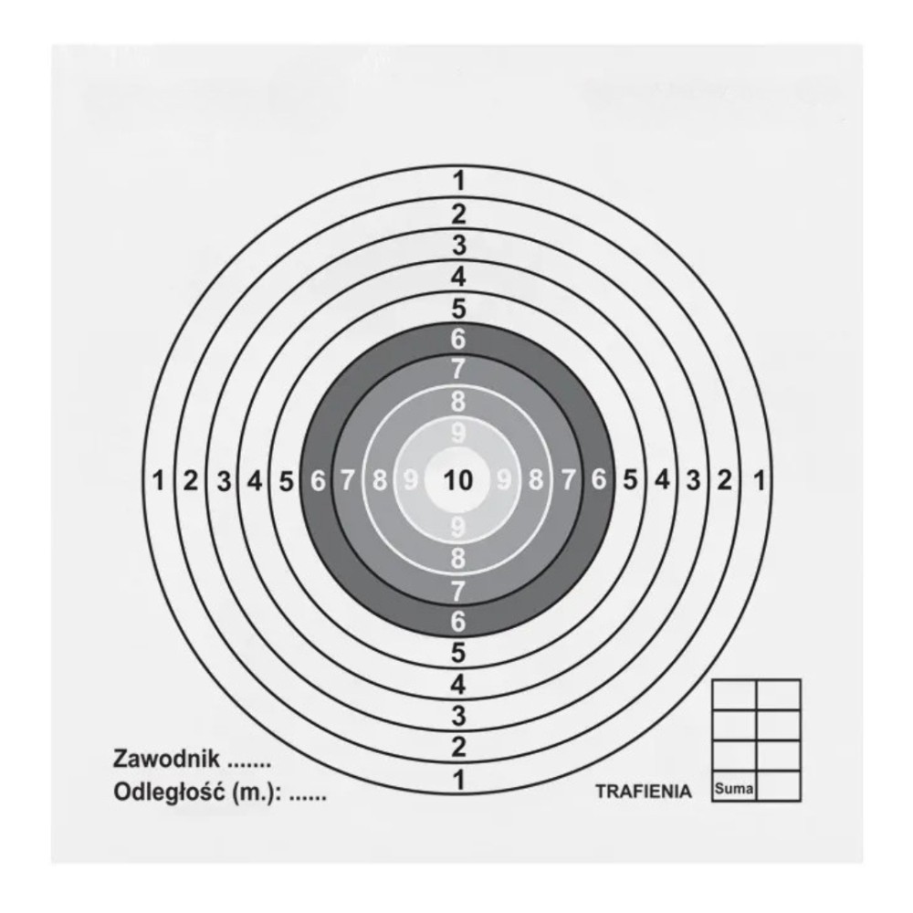 Designul clasic alb-negru cu inele concentrice și punctaj central (1–10) permite evaluarea rapidă a performanței. Țintele sunt compatibile cu arme airsoft, pistoale cu bile, puști cu aer comprimat sau tir cu arc.