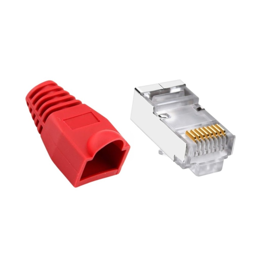 Set 100 x mufa ecranata + manson de protectie, RJ45, CAT5 CAT6, 8 pini 8P8C, rosu Aceste mufe ofera o solutie compatibila si usor de utilizat pentru cabluri cu diametru mai mare, mufele fiind realizate din materiale de calitate, sunt ecranate si indeplinesc standardele de certificare a calitatii. Mansonul aplica peste cablurile LAN Ethernet mufate cu conector RJ45 Cat 5/5e sau 6. Este realizat pentru acoperirea conectorului RJ45 cu scopul de a asigura protectie si a intari baza legaturii cu cablul.