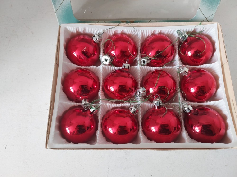 Set 12 globuri de sticla, vechi, vintage, mici, rosii