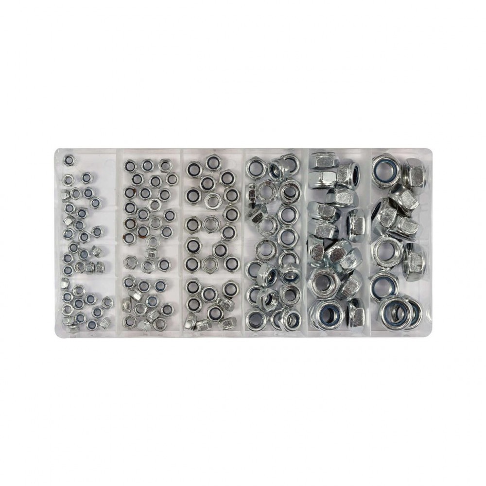 Set de 146 piulițe metrice cu protecție antișurubare. Setul include dimensiuni: M4, M5, M6, M8, M10, M12. Întregul a fost plasat într-un ambalaj convenabil de tip „sortator”.