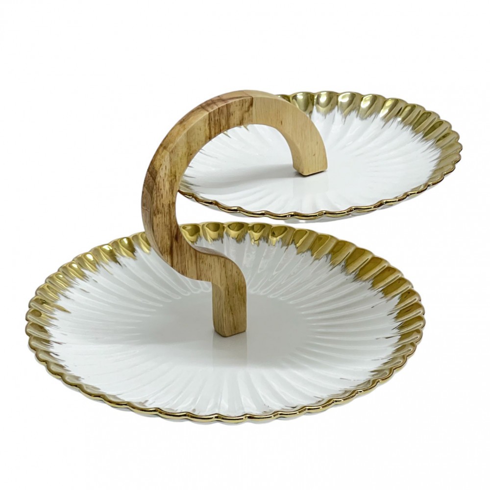 Set 2 farfurii Supraetajate Candy Bar, Alb cu Auriu, Portelan cu suport lemn, 28x20 cm