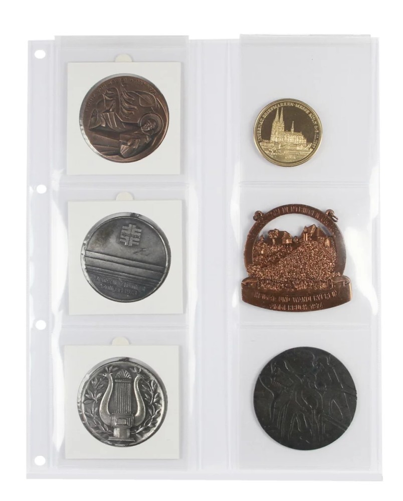 Folie in format A4, cu 2 fasii transparente dintr-un material foarte transparent ce nu ataca monedele. Fiecare fasie gazduieste 6 monede de maxim 75 mm in diametru. Intercalari de carton negru, Ph neutru. Pachet de 2 folii