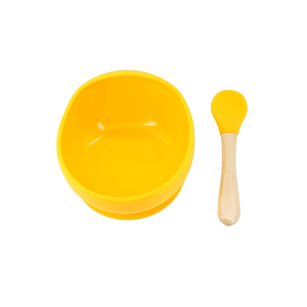 Set 2 piese diversificare bebelusi si copii din silicon, bol cu ventuza, lingurita din lemn si silicon, pentru gustari