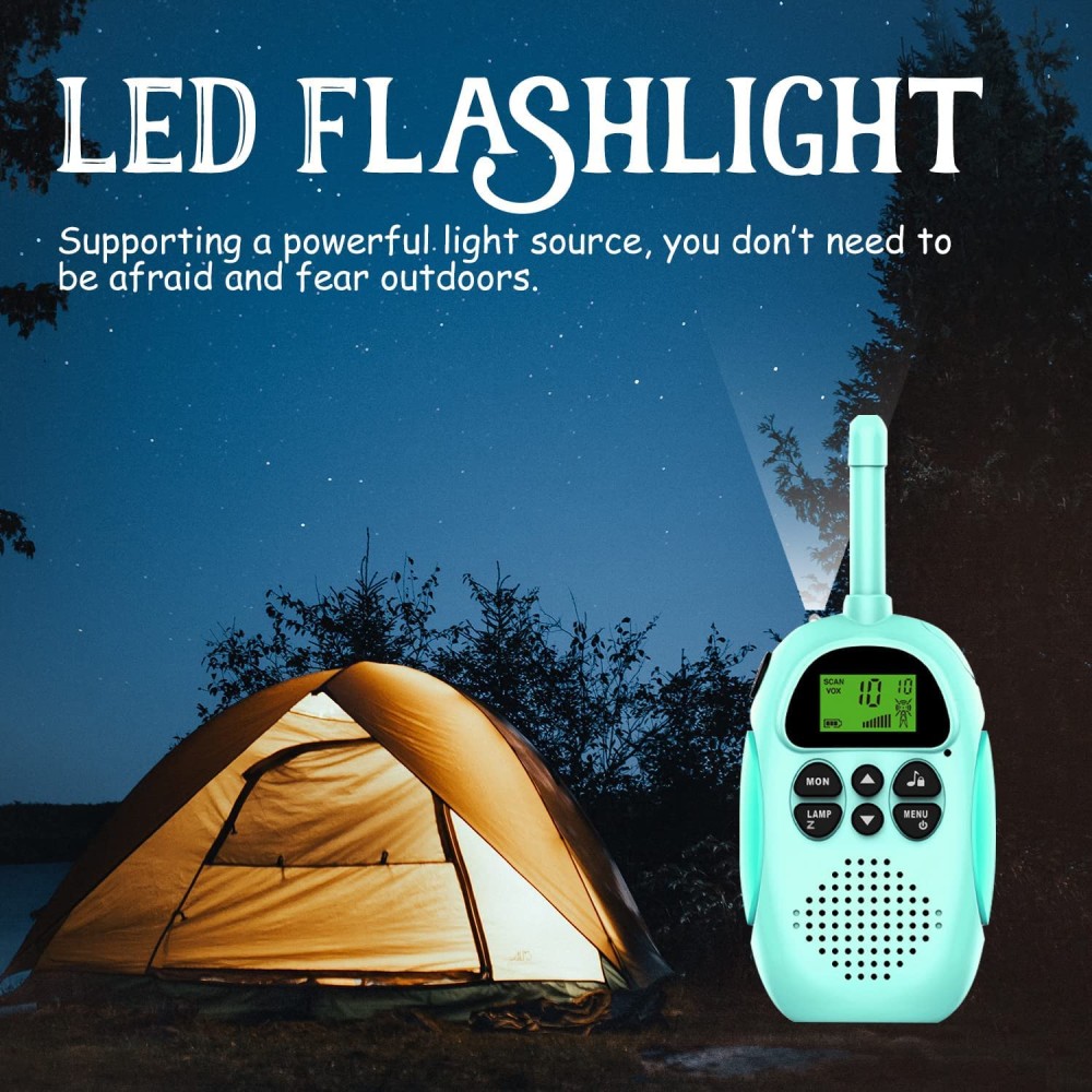 Setul nostru walkie talkie pentru copii are o calitate clara a sunetului neteda, cu nivel reglabil al volumului. Tehnologia de anulare a zgomotului asigura ca sunetul clar poate fi receptionat intre tine si copii. Lanterna bullt-in ii face pe copii sa se distreze mai mult noaptea. Copiii dvs. se pot bucura de joaca pe distante lungi si pot deschide o lume de posibilitati in aventurile in aer liber ale copilului dvs., cu o autonomie impresionanta de 3+ KM.