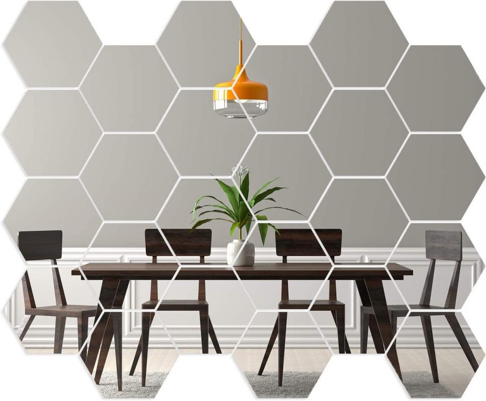 Culoare:: Argintiu. Utilizare:: Sufragerie. Utilizare:: Dormitor. Utilizare:: Camera copilului. Utilizare:: Hol. Utilizare:: Birou. Tip:: Fara rama. Inaltime:: 16 cm. Latime:: 9.3 cm. Lungime:: 16 cm. Greutate:: 200 g. Material cadru:: Acril. Diametru:: 18.5 cm. Tip montare:: Perete. Functii:: Rezistenta la impact. Functii:: Rezistenta la zgarieturi. Functii:: Rezistenta la umezeala. Forma:: Hexagon. Tip oglinda:: Sticla acrilica. Numar bucati/set:: 24.