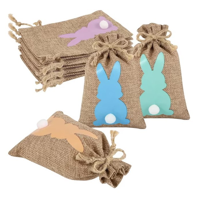 Punga mica este imprimata cu un design frumos de iepure (rosu, portocaliu, galben, verde, albastru, violet) si decorata cu pompomuri albe, perfecte pentru ambalarea cadourilor mici.