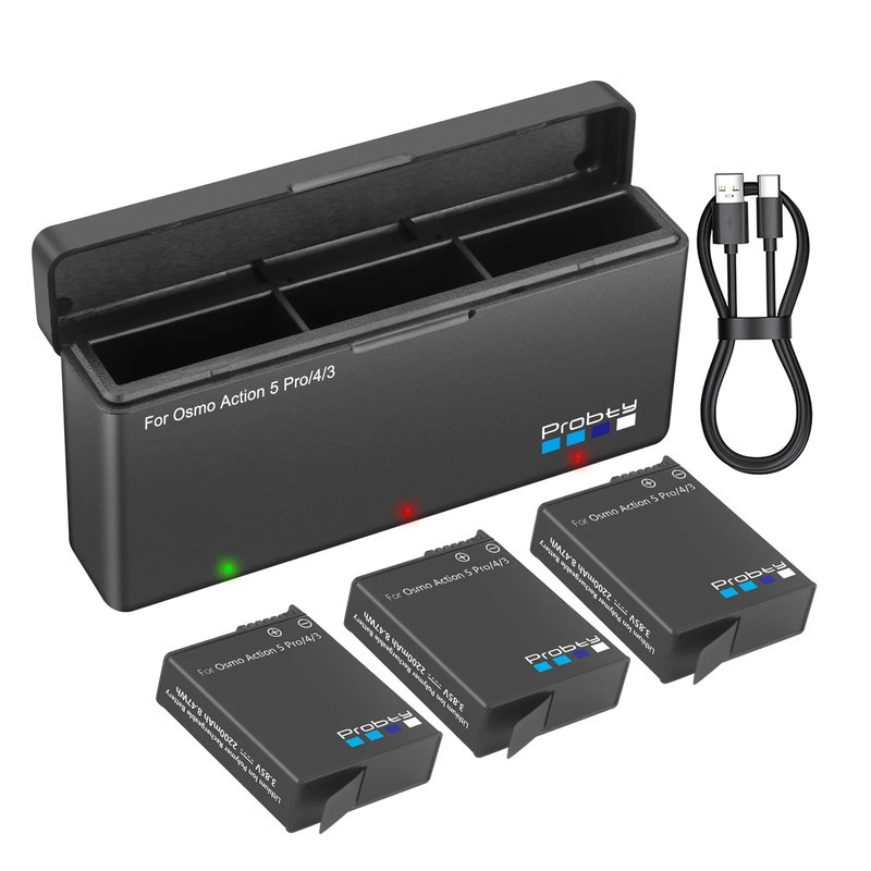 Set 3 acumulatori 2200mAh + incarcator triplu cu USB-C pentru camere actiune DJI Osmo Action 6 / Action 5 Pro / Action 4 / Action 3 / DJI Osmo 360